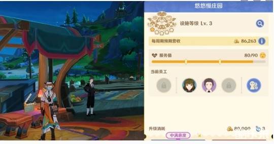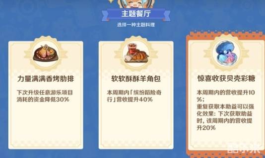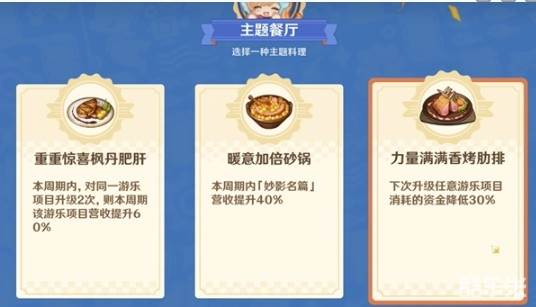 1、每个周期一开始找爱可菲吃料理,前期料理选增加营收的,有个整体营收善加料理是一个成长性料理,每次选择都会增加金币加成的百分比,没有增收料理就选普通的项目增收或者消费打折,员工免费升级的料理可以留到后续员工需要25升30级的时候在选择。