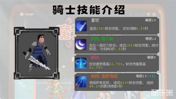 这款游戏内的骑士技能很像英雄联盟的盖伦呀(个人感觉),骑士的技能强度还是不错的,放在前40关卡,可以很容易的就把小怪血量压的特别低,能让友军几下普攻就送走,绝招伤害还不错,在技能这块也还行,但是骑士用到后面关卡的时候,伤害真的特别低呀,压根就惩戒不动小怪,所以说前期能用,后期可替换其他英雄。