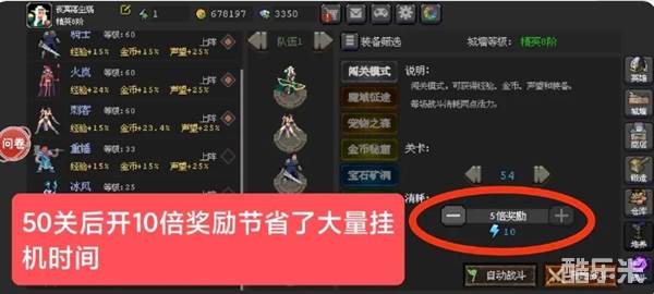 开局应该会卡第七关和第十关。记得回退一关开双倍刷装备和经验。关卡进度达到50后可以挂机更高倍率了,不然太浪费时间了。