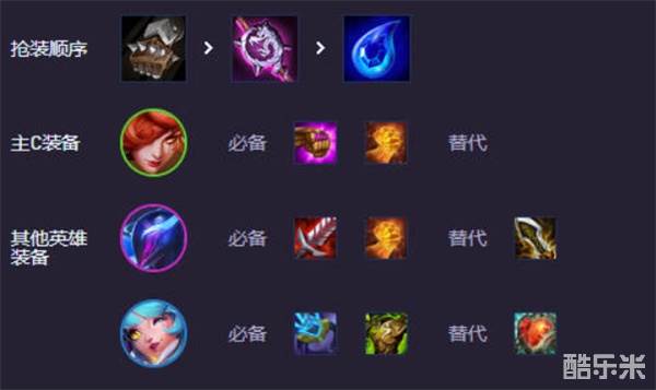 珠光护手 + 正义双标配是卡特爆杀的核心输出来源,妮蔻作为前排控制与减抗关键,需要堆坦度撑线。