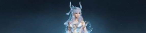 淡紫色披肩长发柔顺飘逸,似被山间灵风轻拂。头饰以透明材质打造,呈夫诸角状,线条流畅,其上点缀金饰与蓝宝,清冷闪耀。