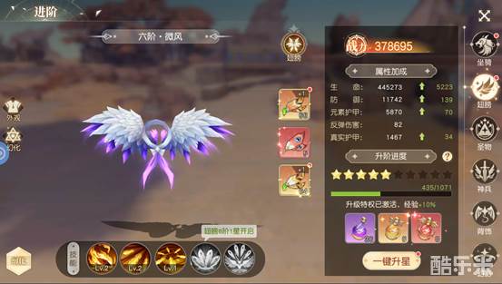 翅膀:达到开启等级,完成对应等级的主线任务后即可开启翅膀系统。翅膀可以给角色带来强大的属性加成、强力技能以及炫酷的翅膀形象。