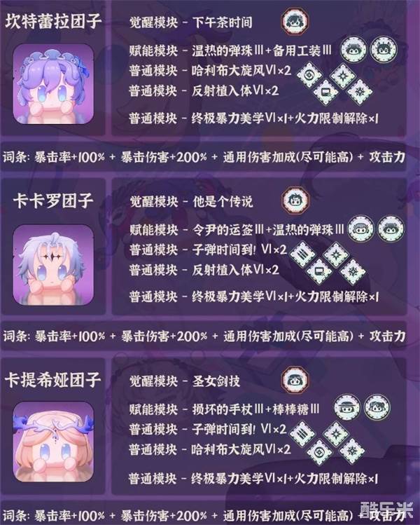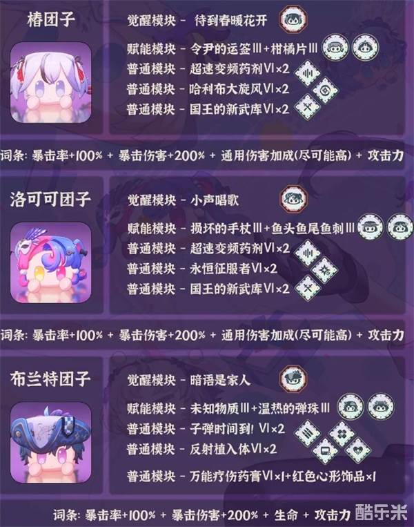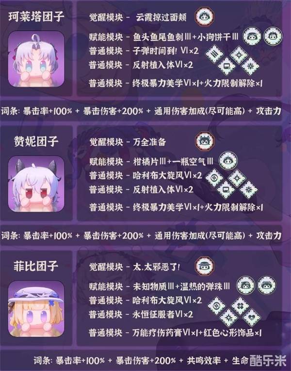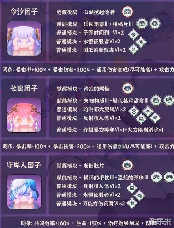 鸣潮全团子培养大全,在《鸣潮》“团团团团转”活动中,玩家将会操控多达12位团子 参与战斗。如何高效培养每位团子呢,那么在词条和模块上就需要合理搭配了,下面酷乐米小编为大家带来鸣潮全团子培养大全助你轻松通关活动关卡。