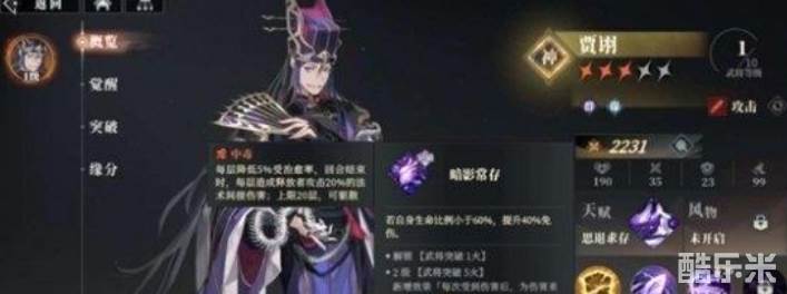 3、贾诩作为阵容主C,两大核心机制都与60%血线相关,低于该血线则获得大量减伤加成,并在受击时高几率进行反击,受击和反击都能为目标叠毒,同时为自身回血。