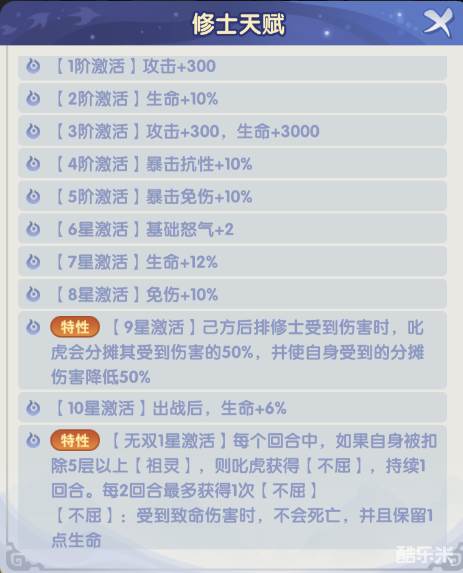 天赋星级提升后,功能全面(保护、回复、团队增益),是异界阵容的核心肉盾。