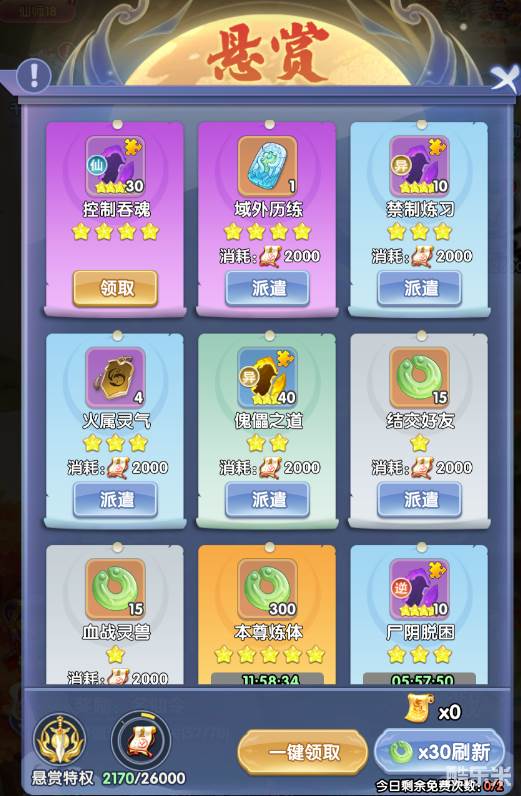 2、 悬赏:悬赏任务能获得修士碎片材料,建议道友们选择四星修士碎片材料哦,通关主线副本和挂机可获得悬赏值用于做悬赏任务。