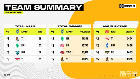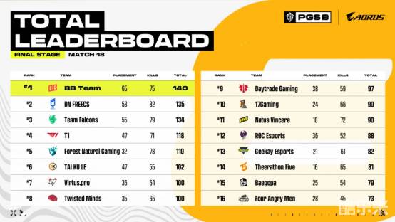 而BB战队在第四把和第五把中,也都冲进了前4。特别是第五把的对局,面对T1、NAVI和FOR的围攻,依然保持着冷静的运营策略,并在最后凭借一颗燃烧弹,成功双杀了T1战队,拿下胜利。