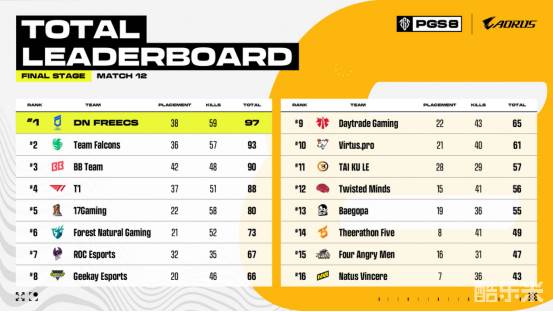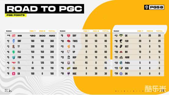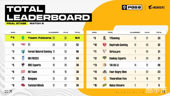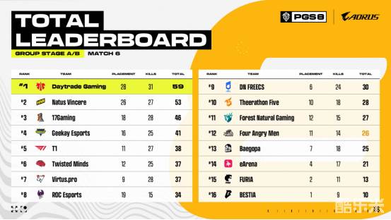 根据此前的规则,PGS7&8均采用了经典双阶段赛制,24支战队将分为三组(A/B/C组)进行为期三天的角逐,每天6场比赛,总积分前16名晋级决赛,末位8队淘汰。晋级的16强经过3天18场的鏖战后,积分榜榜首战队将加冕冠军。接下来,我们就一起来看看本次PGS8的精彩回顾吧。