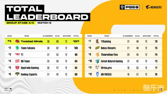 三天小组赛后,TWIS以107的总积分领先,FLC和T1紧随其后。PCL赛区的17战队也成功杀进前10。晋级总决赛的16支战队分别为:TWIS、FLC、T1、BB、DAY、GK、17、NAVI、T5、FOR、VP、DNF、ROC、TKL、BGP、4AM。