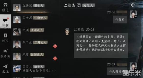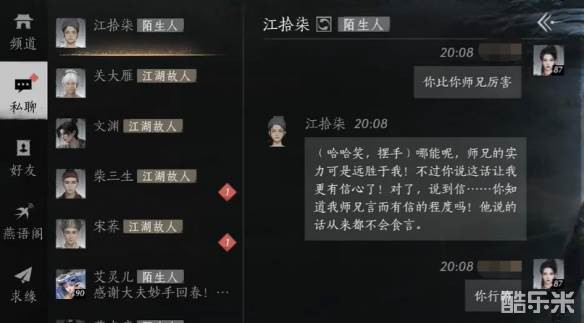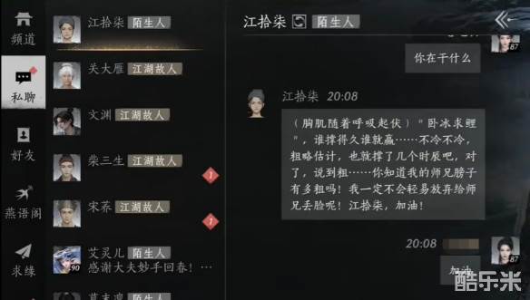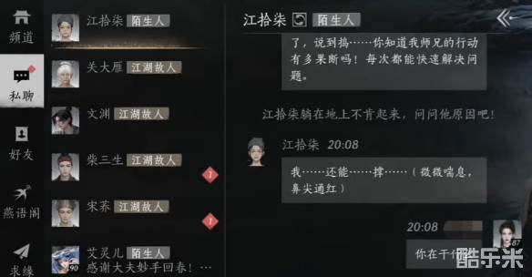 在燕云十六声中江拾柒这个江湖故人在白雀经阁西边找到,他一直躺在冰面上不起来,玩家们只需要问问他干嘛要这样获得原因就可以成功结交了,还没有结交成功的玩家们可以在下面参考话术。感兴趣的小伙伴们下面和酷乐米小编一起来看看吧