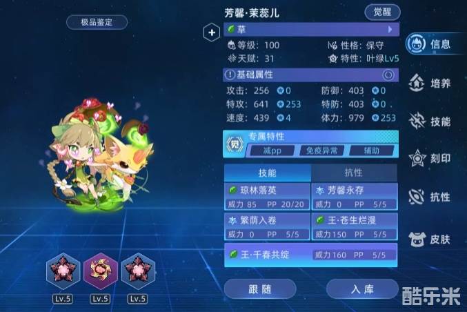 茉蕊儿通常以茉蕊儿和芳馨・茉蕊儿这两种形态活跃于战场,作为草系精灵王,她为团队提供的辅助作用不容小觑,从技能方面来看,拥有如“王・万物枯荣”“花丹荼蘼”“一路繁花”等技能,即便不幸战败,专属特性也可给后续登场的伙伴提供护盾,并且让队友免疫异常状态,这一特性在对战中意义重大,能确保己方后续上场精灵的生存能力,使其免受敌方异常状态干扰,得以顺利施展技能,茉蕊儿在战斗中还可以先利用技能保护自身,削弱敌方之后再为队友提供增益效果,进可攻、退可守,是团队中可靠的辅助力量。