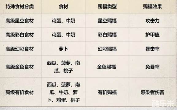 明日之后有机食材制作的料理有哪些,游戏中有许多料理菜谱,玩家制作食用后可以为自身增加各种不同的属性,还有一种有机特殊食材制作出来的料理,食用后除了可以增添对污染生物伤害外,还会附带额外赐福效果哦,下面酷乐米小编就为大家带来这些特殊食材制作的料理。