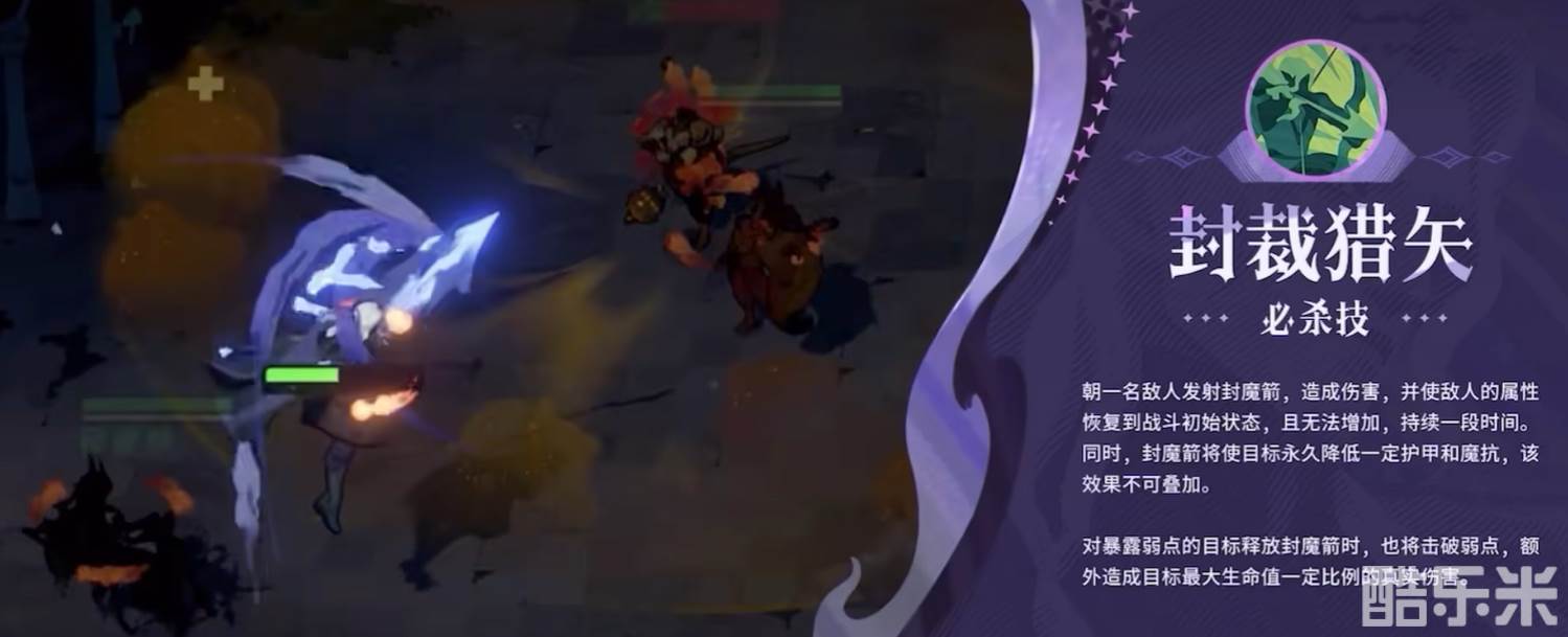 因度厄的技能设置充满了策略性和高爆发性,特别是在处理敌人增益buff和弱点的方面上,他的表现堪称卓越。首先他的技能“封裁猎矢”,一箭射出,不仅能造成大量伤害,还能让敌方的所有增益效果归零。敌方所有增益效果都会被彻底清除。更有意思的是,这个技能还能永久降低目标的护甲和魔抗,让后续的输出更加痛快。并且如果你用这招对敌方的弱点进行打击,还能引发额外的真实伤害,简直是一个有着强大控制和输出的双重技能。