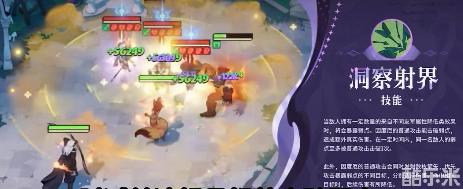 接下来是他的第二个技能,“洞察射界”,这个技能将因度厄的普攻提升到了一个新的高度。当敌人身上叠加了多个来自不同友军的属性减益时,他们的弱点就会暴露出来,而因度厄的普攻可以精准击破这个弱点,打出不小的真实伤害。值得一提的是,这个技能让因度厄能够对多个敌人进行有效输出,而且还能够优先击中暴露弱点的目标,让他在团队战斗中扮演起了核心输出的角色。