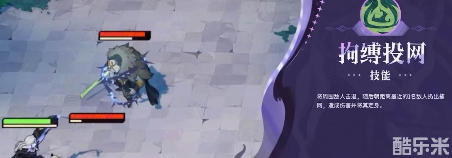而他的第三个技能,“拘缚投网”,不仅是一个带有控制效果的技能,还能通过击退敌人并给目标施加定身效果来为团队创造输出空间。这招的控制效果十分关键,尤其是在敌人冲锋陷阵时,因度厄能够轻松将敌人逼退并精准锁定目标,这让他的输出空间得到了极大的保障。