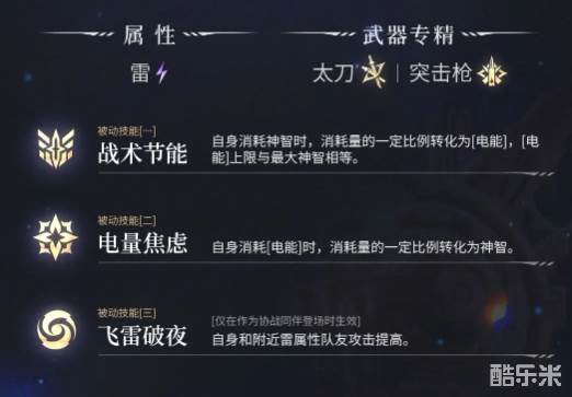 雷黎瑟还有三个不一样的被动技能,可以迅速的拉满战斗力。战术节能这就仿佛是一个能量转换器,可以一方面消耗神智,一方面又将消耗的能量直接全部变成电能,可以储存起来。电能的上限和最大的神智数值是完全一样的。这样一来就不需要担心在攻击的过程中出现没有能量的情况,可以让大家放心的使用技能。可以把整个战斗的节奏全部都掌控在手掌心中。电量焦虑这一个技能还是比较实在的,可以将神智能还有电能进行转换,如此就可以反复的利用带来超强的续航能力。