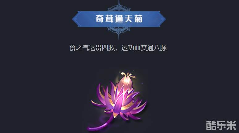 第3种草药的名字叫做奇茸通天菊,它的外形是一朵美丽的紫色菊花,中间的花蕊十分明显,整朵花都散发着金色的光芒,因此同样十分好辨认,可以使玩家们快速突破修炼的瓶颈。第5种仙草叫做水仙玉肌骨,它的外形看上去仙气飘飘,实际的作用是与奇茸通天菊差不多的。