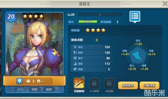 尽管该英雄的统领值较高,在前期较难搭配军阵,但她仍是值得各位领主培养的4星英雄。因为4星亚瑟王拥有着出色的防御属性,自带技能【王前卸剑】具有缴械状态,能够有效保护我方军阵。所以到了中后期,在统领值上限提升的情况下,她将会是个优秀的前阵肉盾。