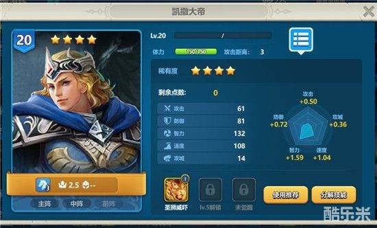 4星凯撒大帝的统领值不算高,且智力属性成长出色,技能【圣狮威吓】能够提供非常优秀的控制效果。同样是值得培养的4星智力型英雄。