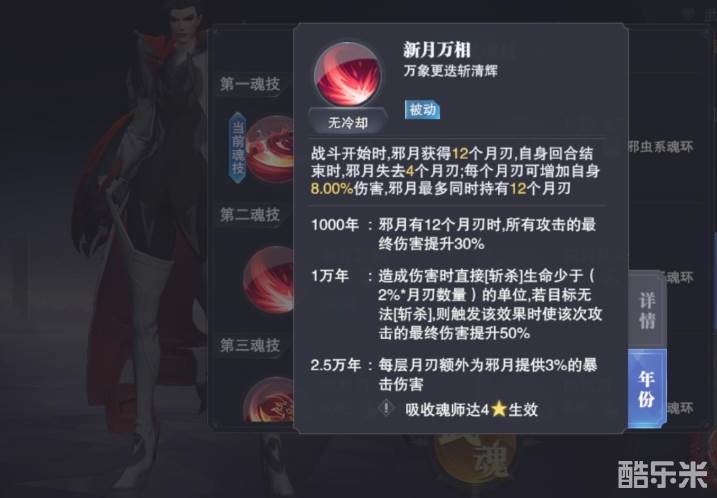 1万年魂环时,若攻击造成的伤害低于目标生命值的,2%乘以月刃数量,且未成功斩杀则此次攻击的最终伤害将大幅提升50%,后期魂环年数提升时,每层月刃还会额外为邪月提供3%的暴击伤害,再看狂刃屠戮技能,这是邪月针对敌方单体的强力攻击手段,可造成6次137%攻击力的伤害,倘若在击杀目标后攻击次数还有剩余,攻击目标便会转移至生命比例最低的另一敌方单位,并且在转移攻击目标时还会额外增加3次攻击段数。