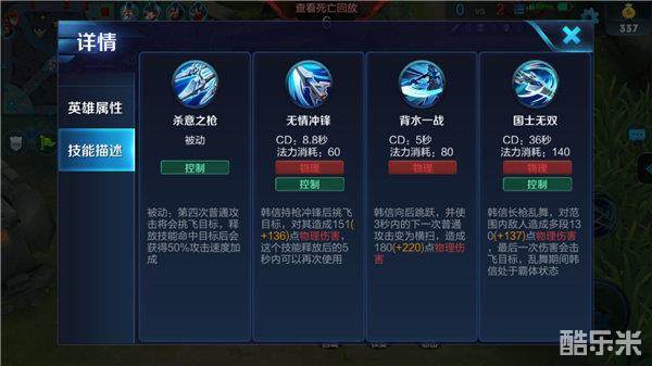 被动技能——杀意之枪:被动技能是韩信打法强势的重要来源之一,普攻输出的同时还能控制敌人,通过施放技能提高自身的攻击速度,能有效的加强战场输出。
