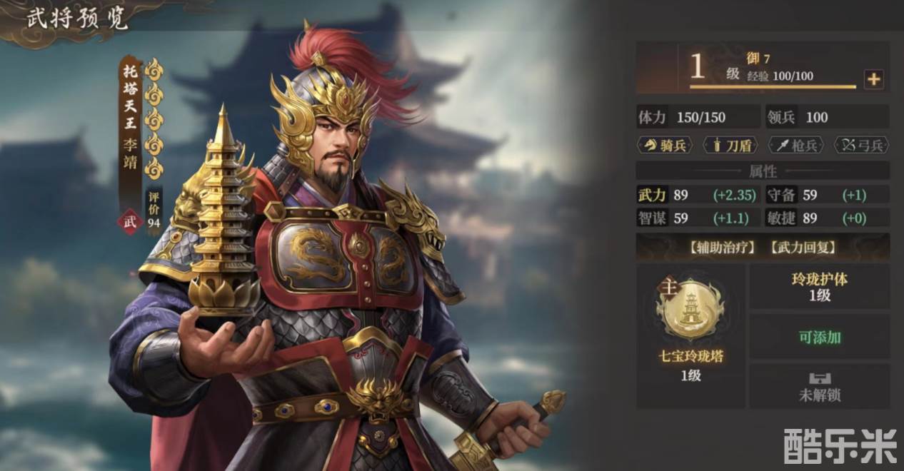 哪吒最佳辅助,带上敖丙组队开荒效果不俗。自带术法【玲珑护体】,可在己方队伍受到伤害时概率回血(每回合最多5次),比较克制连击队这种打多段伤害的体系。灵宝【七宝玲珑塔】降低全队受到的伤害,进一步提高队伍生存能力。除了常规的父子盾/骑阵容外,李靖还能凭借特殊的受击回复机制,在反击队、菜刀队中发挥作用。