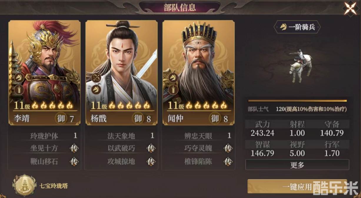 三武将全点武力。李靖提供回复和减伤,同时带坐见十方赋予神算效果提升容错。闻仲提供庚金buff,杨戬提供全队增伤,打出高额伤害。