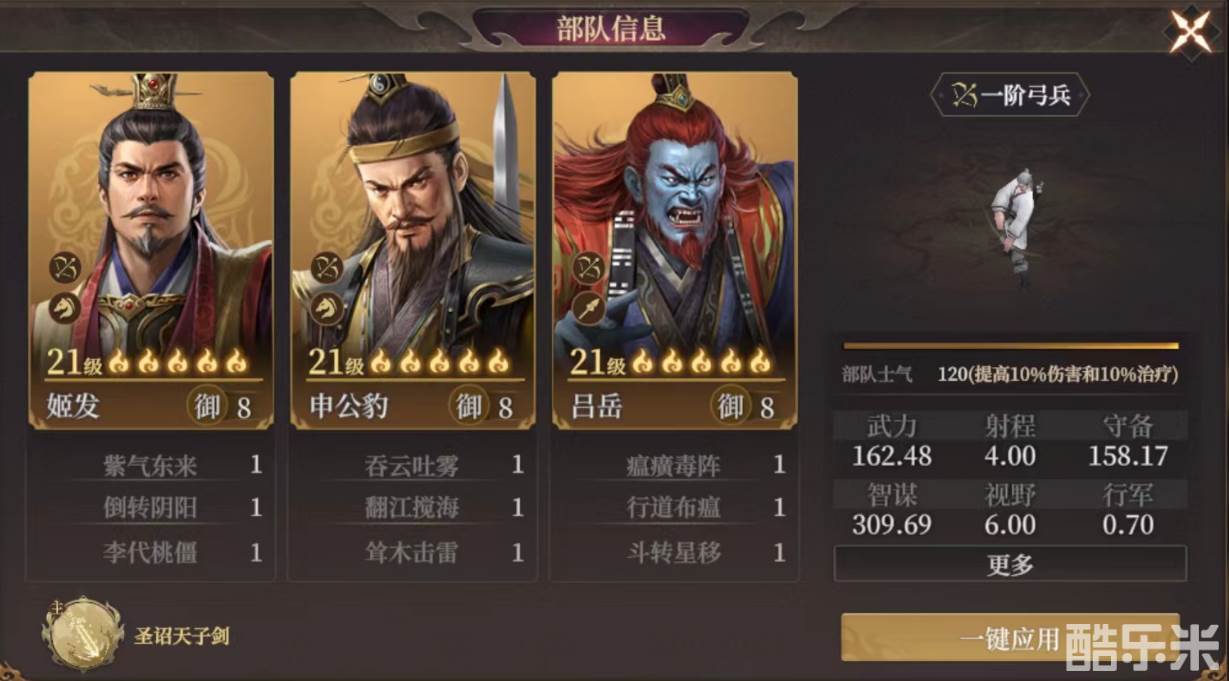 弱水弓:姬发+申公豹+吕岳。三武将全点智力。