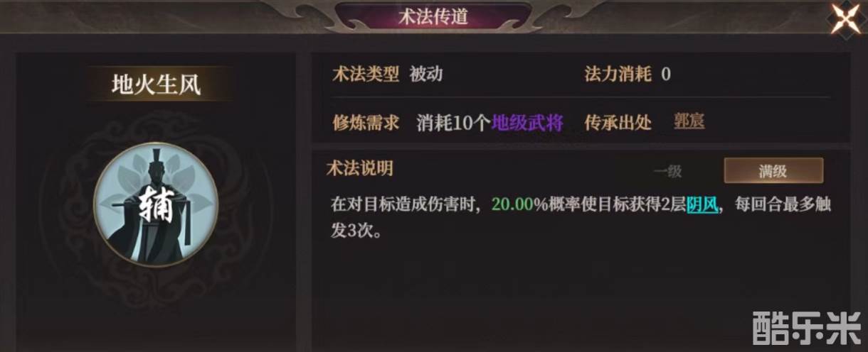术法传道中【地火生风】在封神开天游戏中是被动型术法,该术法叠层效果尚可,但触发概率偏低。需要阴风叠层,且单回合能打出多段伤害的队伍可带。适合该术法的武将:石矶、殷寿、妲己。下面和酷乐米小编一起来看看吧