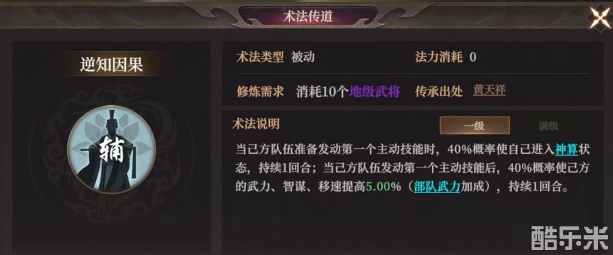 术法传道中【逆知因果】在封神开天游戏中是被动型术法,该术法看似能挂神算buff,而且提升武力、智谋和一速,但实际上应用面有限。根据阵容中其他术法的特性决定是否携带。下面和酷乐米小编一起来看看吧