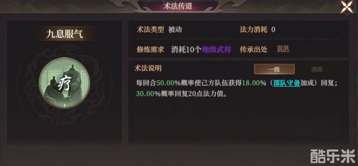术法传道中【九息服气】在封神开天游戏中是被动型术法,该术法概率回血+回蓝。受法力消耗机制影响,哪怕它不够稳定,也依然是T0级别的回复系术法,有则必拿。适合该术法的武将:龟灵圣母、姬昌、李靖、姜皇后、魔礼海等。下面和酷乐米小编一起来看看吧