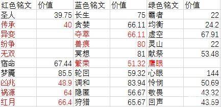首先是根据装备计算的每个五级铭文的价值,不适合法师的铭文已经标红: