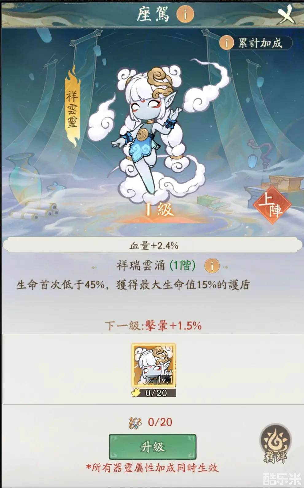 座驾器灵目前加成分为三块:属性加成、独立技能、羁绊加成。属性加成:由于目前已知血量和击晕,所以后续应该还是围绕基础属性和战斗属性/战斗抗性。技能:生命首次低于45%,获得最大生命值15%的护盾。