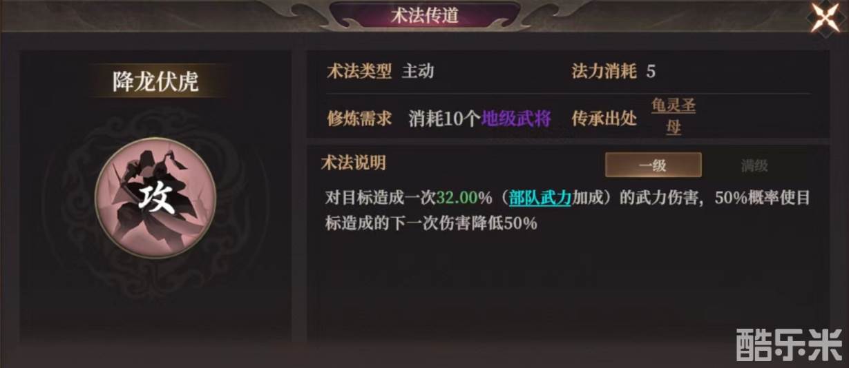 术法传道中【降龙伏虎】在封神开天游戏中是主动型术法,造成伤害的同时,50%概率使目标下一次伤害降低50%。在缺少鞭山移石、崩山碎石、巧夺灵魄等武力伤害系术法时,可用降龙伏虎代替。武力伤害型副C或辅助均可携带。下面和酷乐米小编一起来看看吧