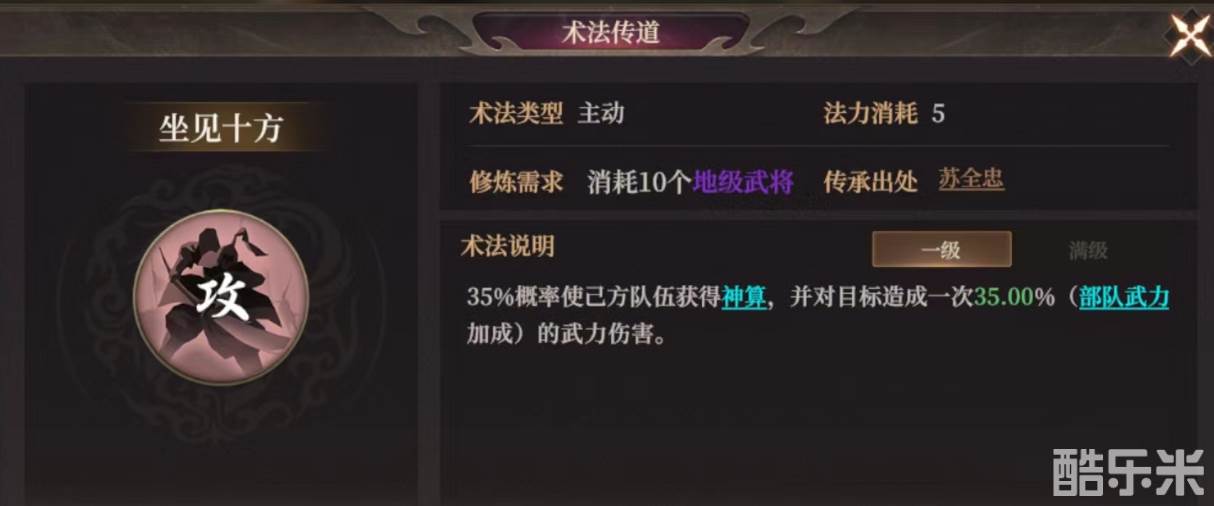封神开天游戏中术法传道中坐见十方是主动型术法,一级效果是35%概率使己方队伍获得神算,并对目标造成一次35.00%(部队武力加成)的武力伤害。武力伤害型阵容的武将均可携带。下面和酷乐米小编一起来看看吧