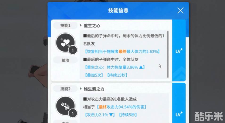 首个被动技能是重生之心,该技能效果是,在最后一颗子弹命中时,可以为当前己方目标,体力数值最低的队友,恢复基于佩珀自身体力数值4.45%的血量,同时,还能够为团队附加一次增益,让所有的队友获得一层重生之心的效果,体力恢复量,会顷刻之间提升6.53%,该buff是可以进行叠加的,最高叠加五层,整体的buff维系时间为15秒钟。