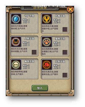 【分布】6个种族王国,军团长代表军团选择国家!【选国】军团前四不能选同一国家,战斗力最强国不能选!【初始】每个国家初始有1个主城,2个辅城,主城不能被攻打,也不能放置守军,其余为野城,可以攻打,如果攻城成功,会有防守军帮你守城哦!
