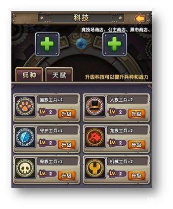 【兵种科技】升级后可以生产相对应的高级兵种【天赋科技】升级后国战战斗中会有相应的光环效果,可以各种叠加呢!