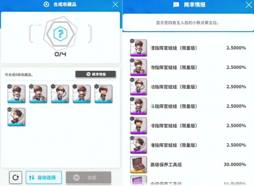 低级蓝色的收藏品,凑齐四个之后,就有2.5%的概率,可以合成限量版的紫色级别收藏品,同理,四个紫色级别的收藏品,也有一定的概率能够合成金色收藏品。