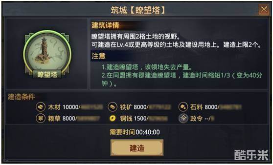 瞭望塔建造条件调整为4级以上任意土地或建设用地,视野固定为2格,不再与土地等级相关