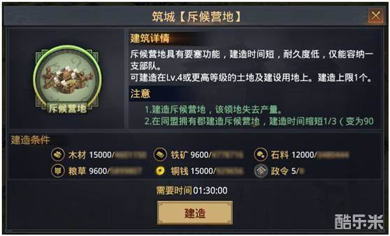 同时,其建造时间为90分钟,耐久值160,可放置一支部队,并且不可升级