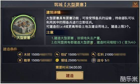 大型要塞建造条件调整为4级以上任意土地或建设用地,耐久值不再与土地等级相关,并且不再拥有设施“城垛”。新大型要塞可以接受预备兵输送并供部队进行立即征兵使用,满级大型要塞可储存40000预备兵