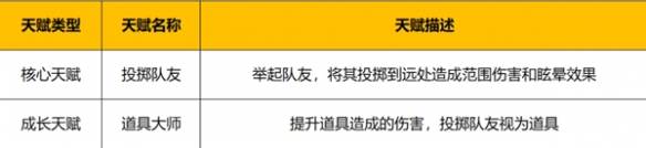 2、开黑标配技能天赋,可以通过将队友当做道具投掷到目标点,同时造成范围伤害和眩晕效果,被投掷者打满伤害,投掷者收割残血。