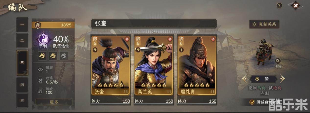 张奎追击骑阵容主要由张奎、高兰英、魔礼青三人组成,推荐兵种为骑兵。