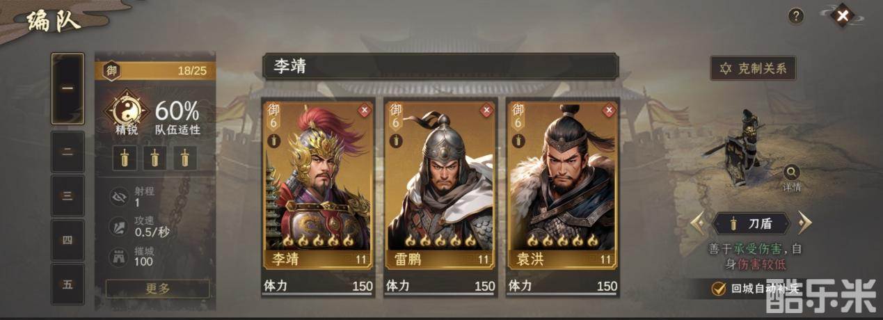 李靖的术法“玲珑护体”可以为队伍提供较为高额的减伤效果,搭配刀盾兵种自身的减伤特性在面对敌方弓兵群体时可以较好的发挥自身续航优势来抵近敌方弓兵。