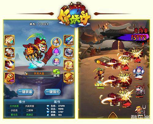 悟空(佛)、金翅大鹏(佛)、牛魔王(魔),皆属橙色卡牌,三人同时上阵,可释放猴、鸟、牛的超现代轰炸“称霸三界”合体技,无厘头的现代战斗画面,对敌方造成的伤害也非常高。