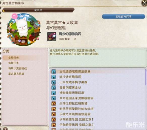 ff14莫古莫古大收集与幻想邂逅是不定期开启的活动,那么该活动内容是什么呢,打开【莫古莫古指南书】做对应的任务即可获得【稀少神典石】,获得之后去找NPC【旅行莫古力】对话使用【稀少神典石】交换道具,接下来就由酷乐米小编给大家带来了详细的《最终幻想14》莫古莫古大收集与幻想邂逅活动介绍!
