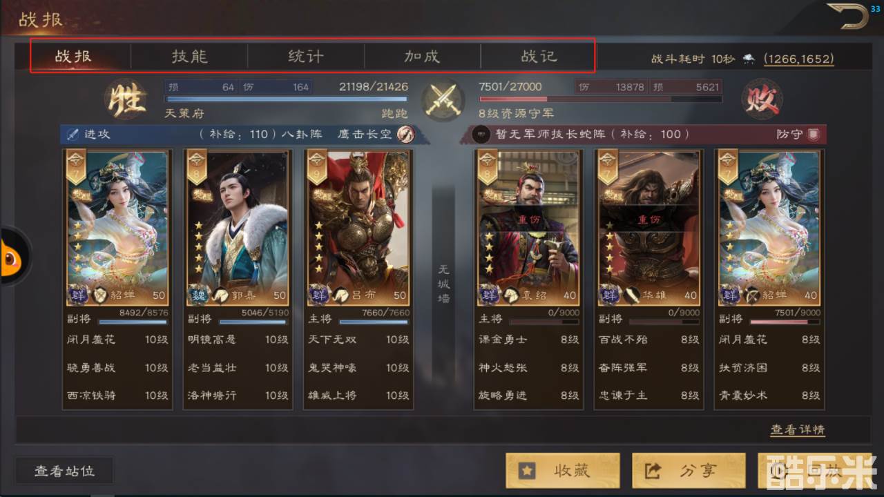 点进战报能看到几个栏,有战报、技能,统计、加成,战记这五个,建议先从战报,技能开始看,然后到统计再到加成最后到站记