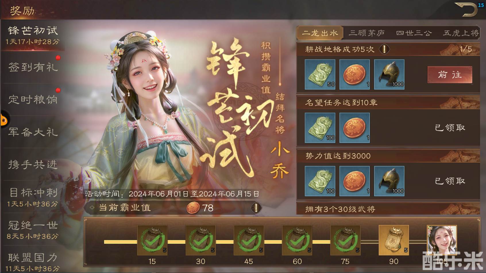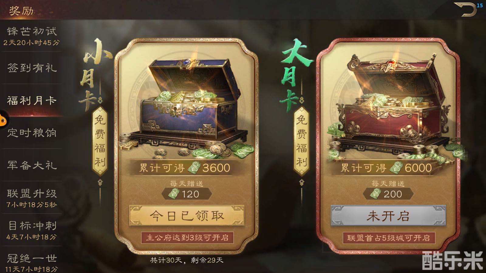 可通过游戏奖励界面,初试锋芒,福利月卡,签到有礼,定时粮饷,军备大礼,携手共进,势力冲榜,联盟升级,目标冲刺,冠绝一世,联盟国力获取。