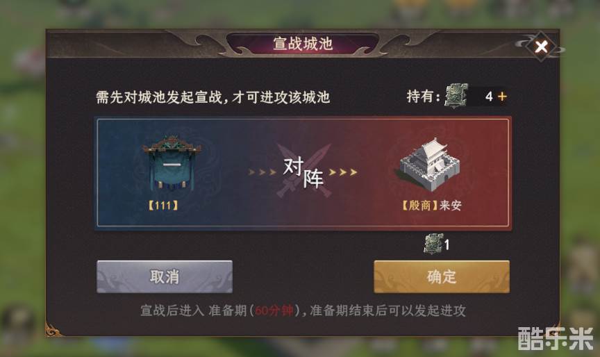 2、点击对应城池宣战后,会消耗宣战令并从临近的友方城市派遣“辎重车”,辎重车抵达目标城市后即可建立先军大营。